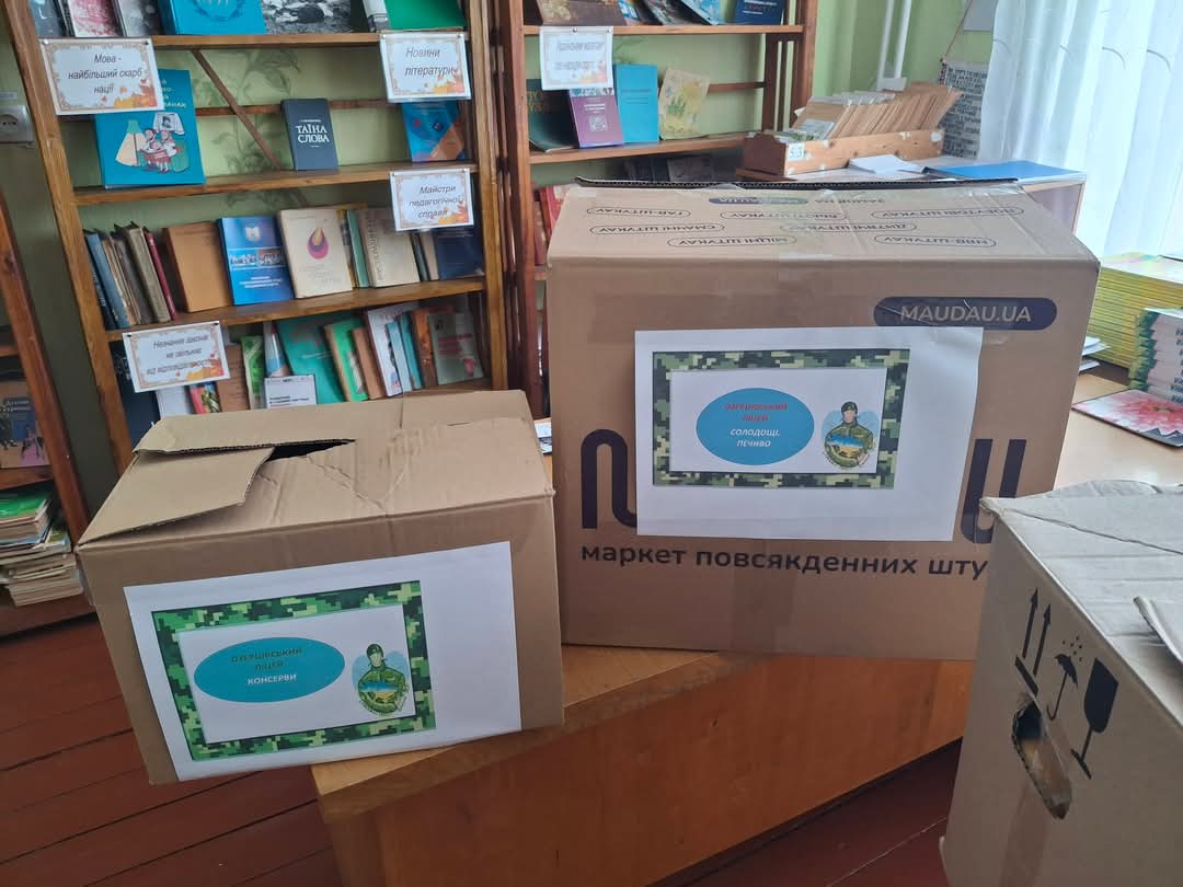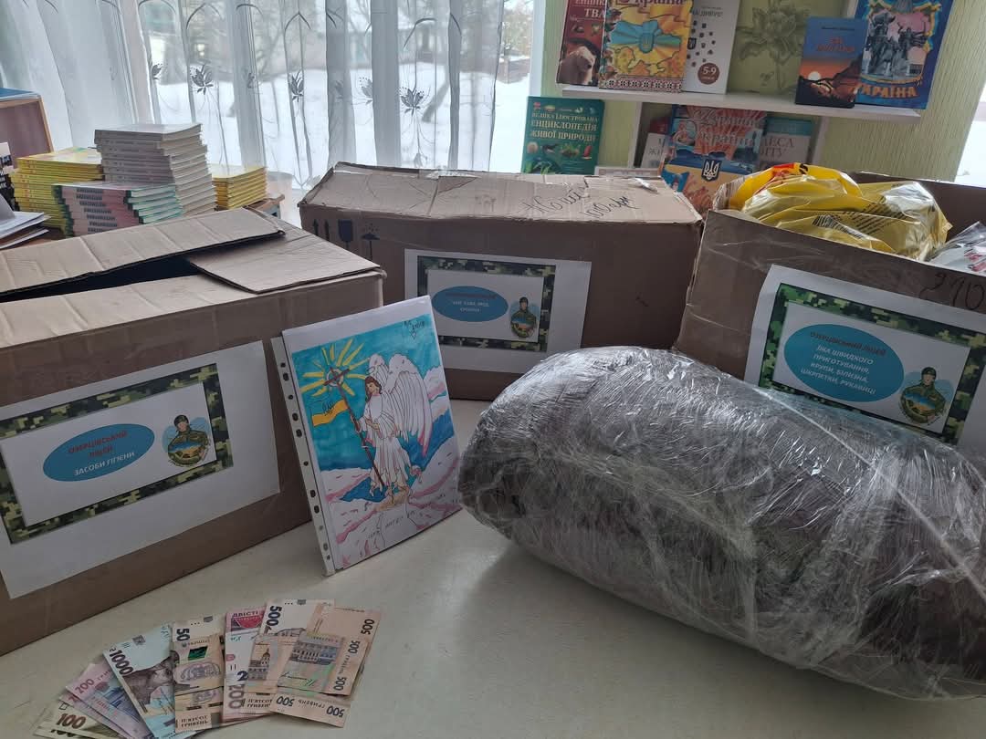 5 великих ящиків допомоги на потреби ЗСУ: їжа швидкого приготування, крупи, білизна, теплі шкарпетки та рукавиці, консерви, солодощі та печиво, чай, кава, мед, сушина, засоби гігієни, ліки та скотч. Дитячі малюнки. Маскувальна сітка та 5600 грн.